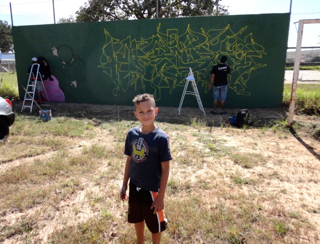 ‘Everybody Hates Chris’. Unfortunately I do not, but told them I would include their compliment in the article. There was also a young boy from the neighborhood hanging out with us as we worked. He was very quiet and stayed by my side as I painted stroke by stroke. He played with the spray cans and was very diligent in lining them up in orderly columns like little soldiers. And as the day came to a close, my quiet little friend helped us pack up when we were finished; nice kid.